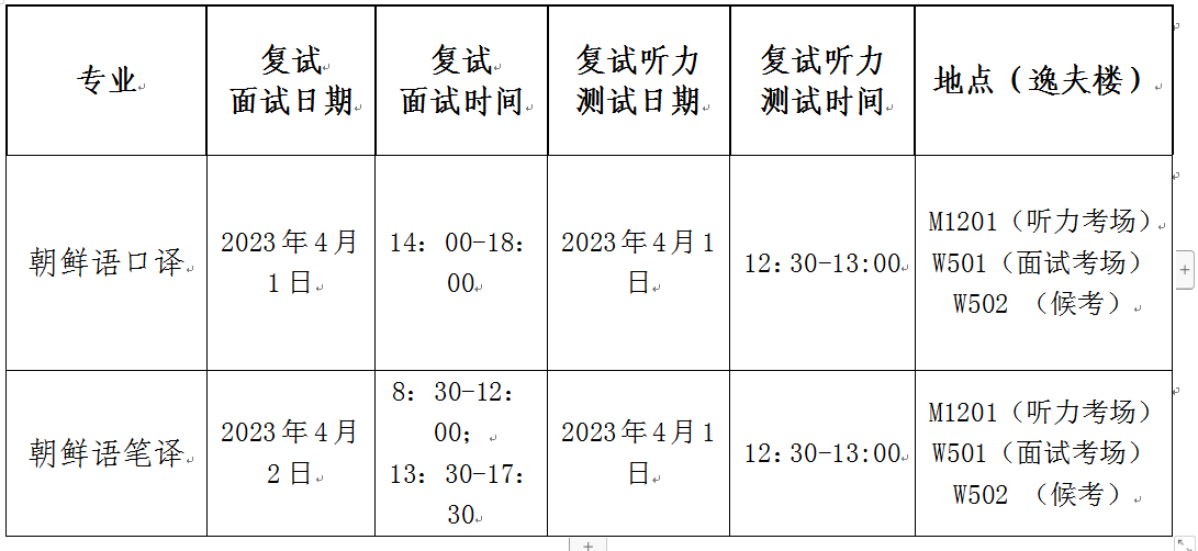 朝鲜语口译、朝鲜语笔译方向的考生于4月1日10:00在马场道校区逸夫楼AX102现场报到,提交复试资格审查材料原件及复印件并扫码加入微信群。原则上群内仅供接收信息使用。紧急情况可以通过群联系,或拨打022-23263272。