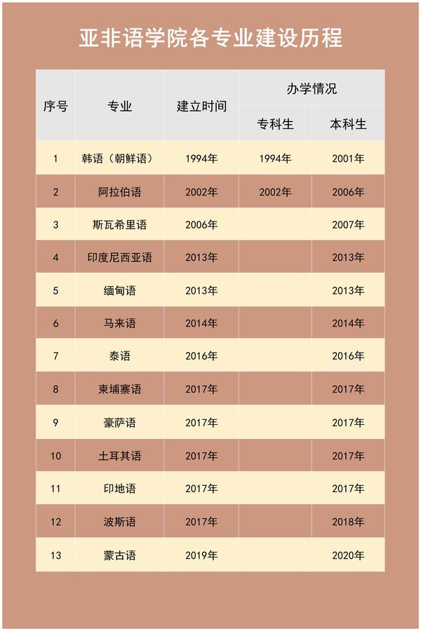 一、学科专业大幅增长。公司在朝鲜语、阿拉伯语、斯瓦希里语3个本科专业基础上,陆续增设印度尼西亚语、马来语、缅甸语、泰语、柬埔寨语、豪萨语、印地语、波斯语、土耳其语、蒙古语10个语种专业,形成“亚非非通用语语种群”。获批3个国家级一流本科专业建设点(朝鲜语、阿拉伯语和斯瓦希里语),3个省级一流本科专业建设点(阿拉伯语、斯瓦希里语和印度尼西亚语)。现拥有亚非语言文学、阿拉伯语语言文学两个学术硕士学位授予权和翻译硕士(朝鲜语口译、朝鲜语笔译、阿拉伯语笔译)专业硕士学位授予权,培养了一批批具有较强的语言运用能力和跨文化能力的国际化外语人才。