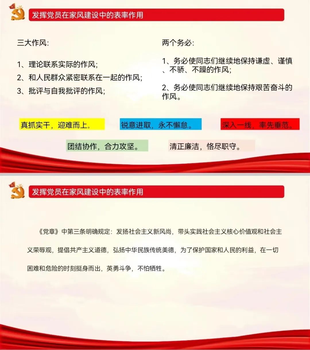 此次党日活动分为汲取优良家风的丰厚滋养”与“发挥党员在家风建设中的表率作用”两个环节。首先,党支部书记刘君带领大家学习中华民族的优秀传统家风,领略中国共产党人的百年家风建设,引导党员们从中汲取精神养分,牢记习近平总书记的殷切嘱托,培育积极健康的家庭观念,践行家风家训,提高自身约束力,在全社会汇聚起昂扬向上的精神力量。